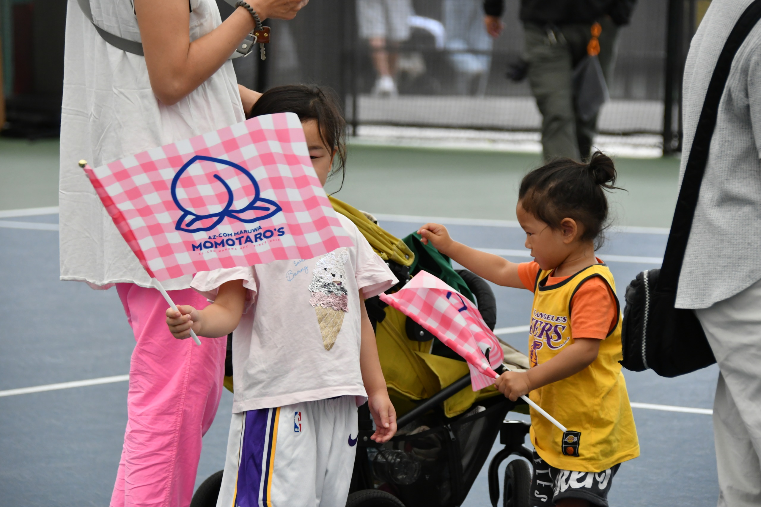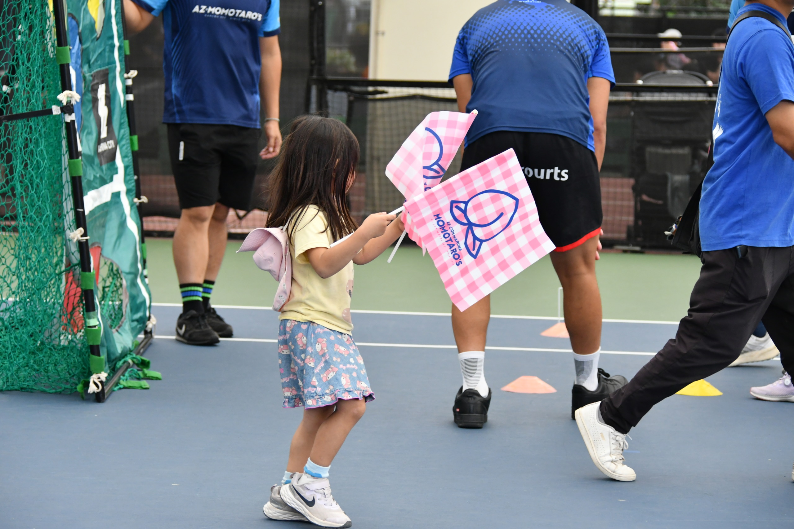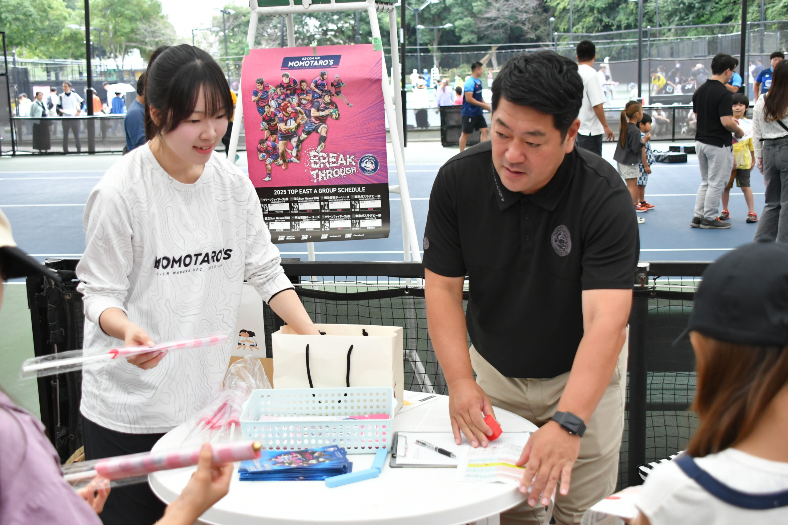 ラグビー体験にきてくれた子どもたちにはMOMOTARO’S桃フラッグ&キャンディーをプレゼント。