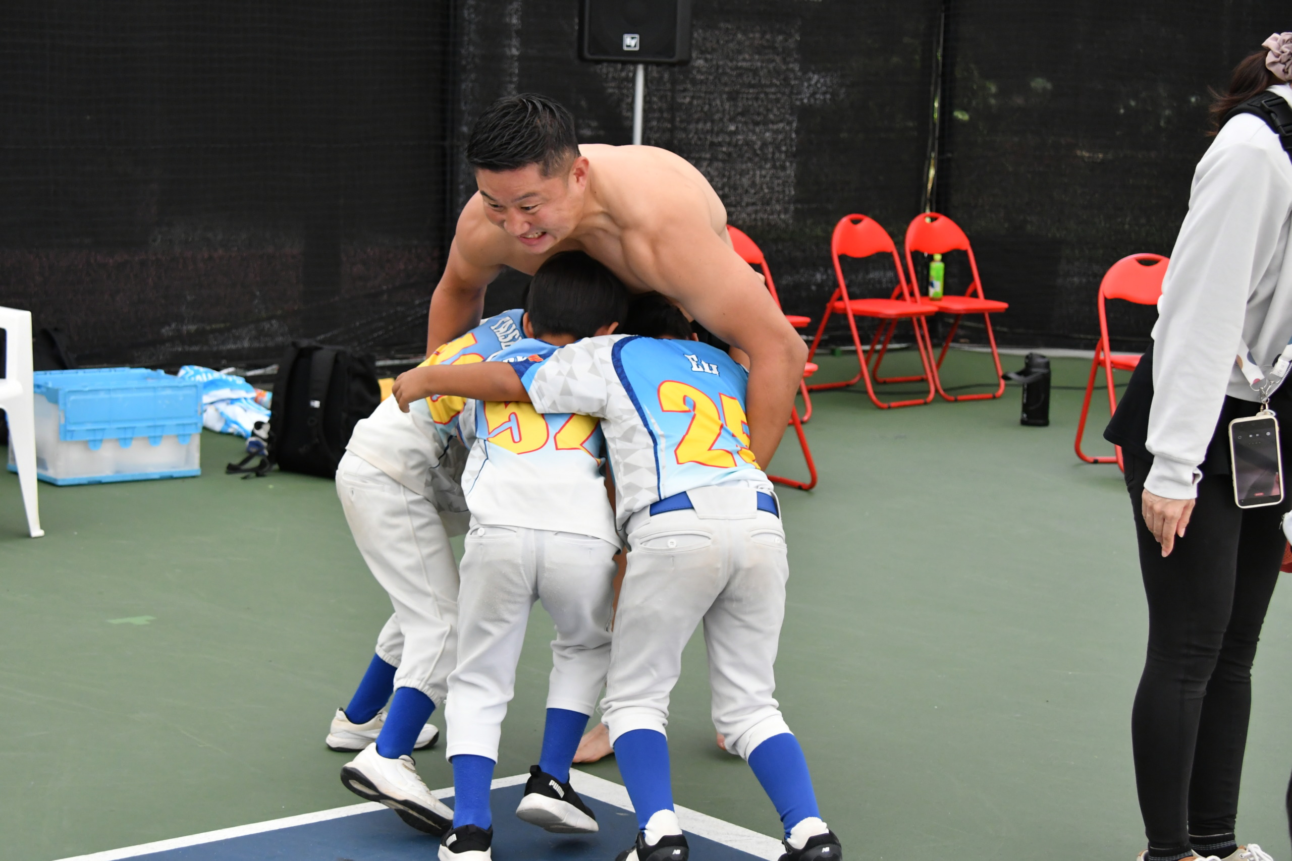 さらに最野球のユニフォームを着た子どもたち3人を相手に奮闘。